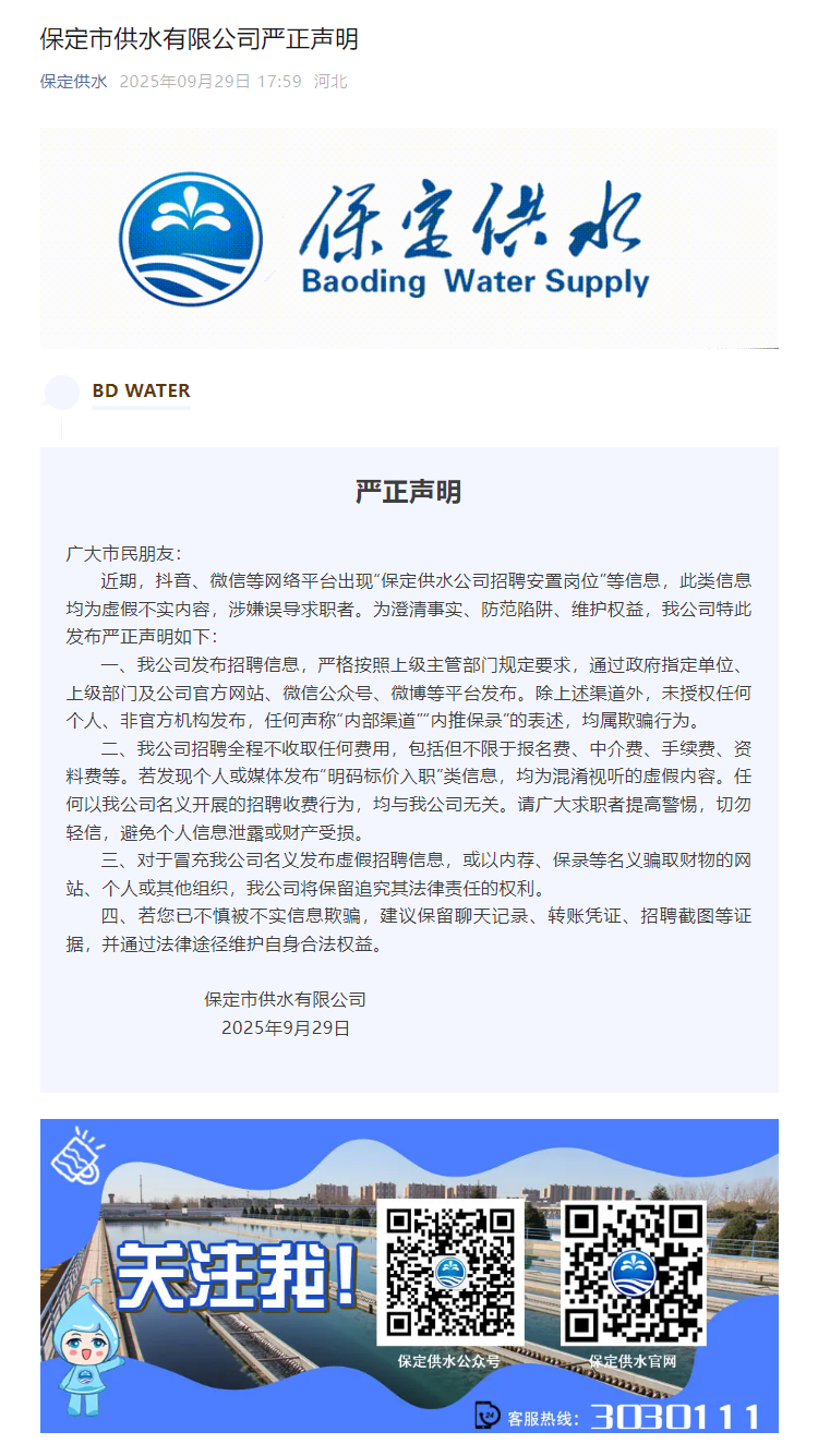 保定市供水有限公司嚴(yán)正聲明